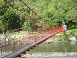 觀林吊橋於民國67年建造,由於年代久遠,加上河床不斷升高,颱風來襲河面水量升高時,常發生水流夾雜的漂流物碰撞橋面,林務局為顧及遊客安全,重新建造新造型的吊橋,橋面提昇2公尺,全長80公,寬1.5公尺,可同時供兩人併肩行走,主鋼索分六固定地錨分散拉力,水平主索口徑也加粗,可穩定橋面,讓遊客行走更安全舒適,朱紅色吊橋橫跨溪谷,在兩岸蒼翠山林和潺潺溪水陪襯下,構成一幅美麗景緻。